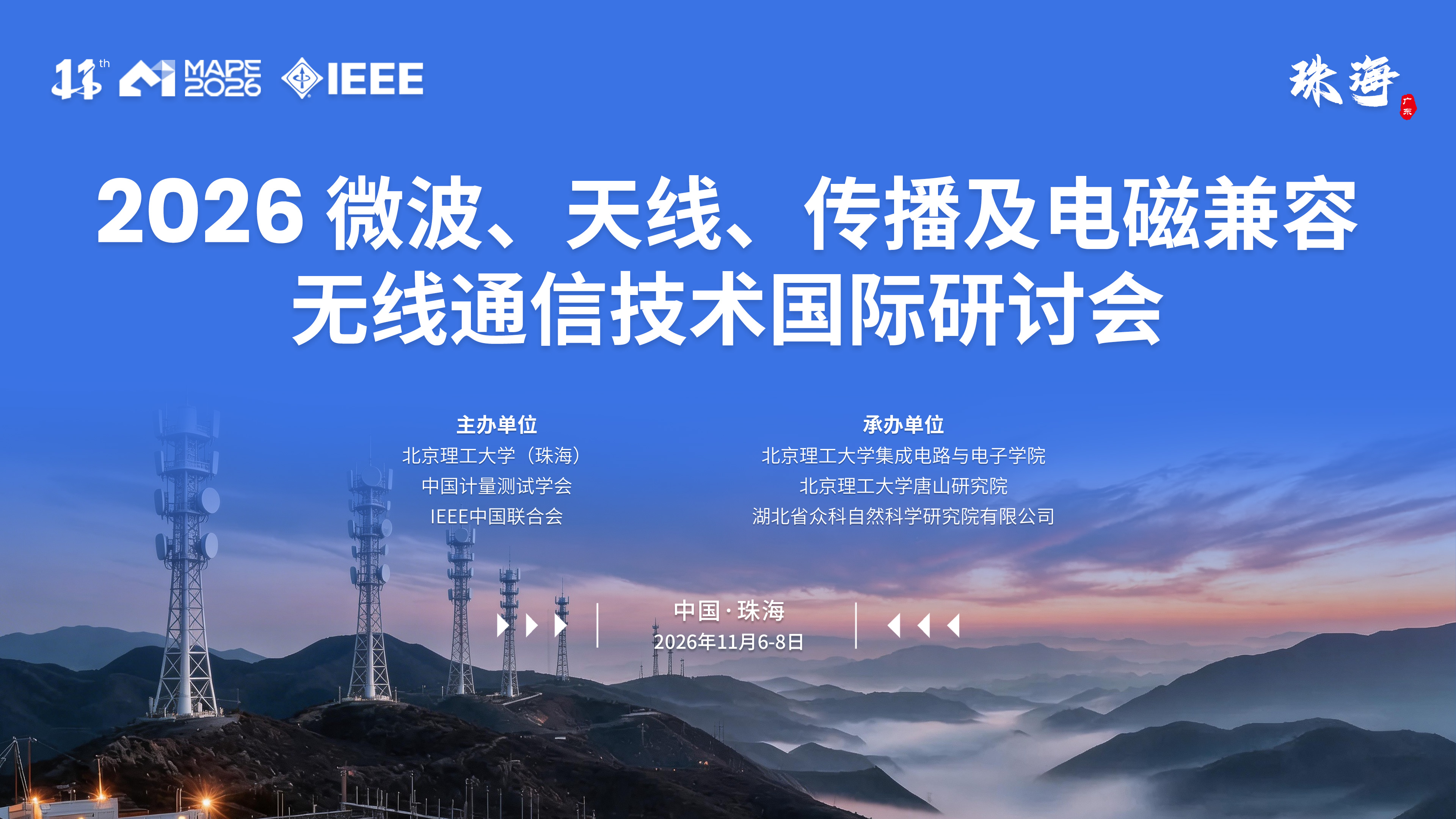 为进一步深化微波、天线、传播与电磁兼容及无线通信技术领域国内外学术交流合作,提升相关学科国际影响力,推动高校、科研机构与产业界在关键核心技术研发、成果转化应用、复合型人才培养等方面的深度产学研融合,由北京理工大学(珠海)、中国计量测试学会、IEEE中国联合会共同主办的2026 IEEE微波、天线、传播及电磁兼容无线通信技术国际研讨会(以下简称:IEEE MAPE 2026),拟定于2026年11月6日-8日在广东省珠海市隆重举办。大会相关详情如下:
